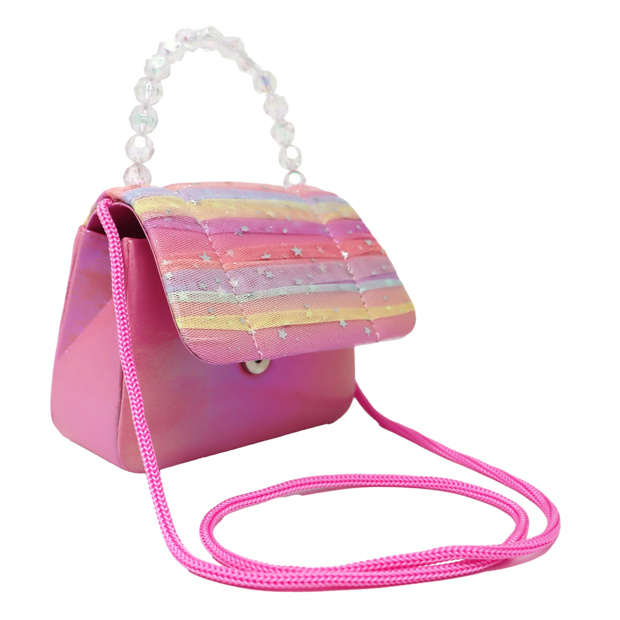 Pink Poppy's Dreamland Handbag is adorned with a gorgeous shinny bright pink fabric paired with a beautiful ruched rainbow tulle that has sparkly silver stars used on the flap. Completed with a beaded handle, magnetic stud for easy closure and an additional cord shoulder strap for hands-free play, it is the perfect accessory for any occasion. This bag perfectly pairs with our dreamland dresses and cape, buy them all to complete the outfit!Designed in Australia