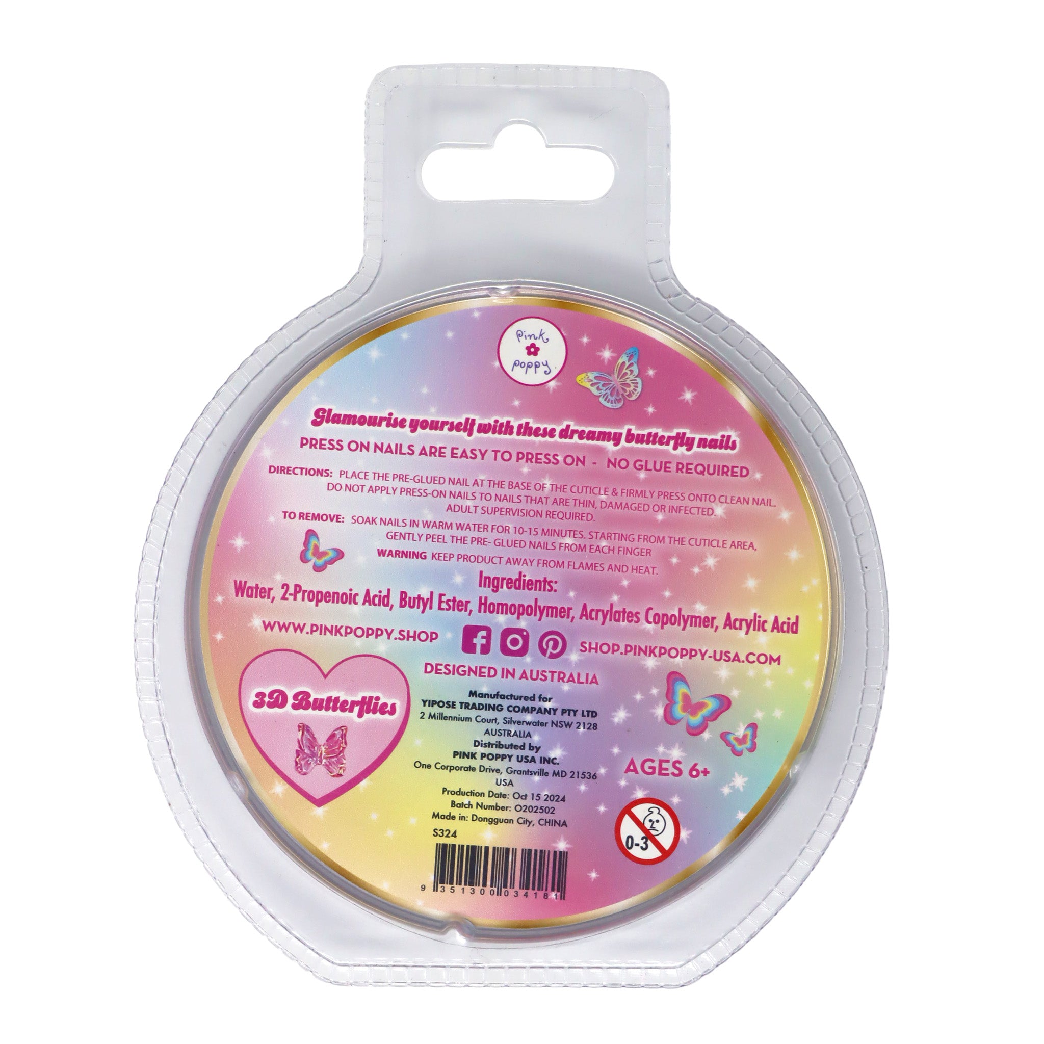 Complete your fabulous outfit with Pink Poppy's 3D Butterfly Press-on Nails. These nails are adorned with stunning 3D butterflies and sparkling gold glitter, creating a magical and enchanting look. These nails feature vibrant, sparkly illustrations of butterflies bringing the magic to life!