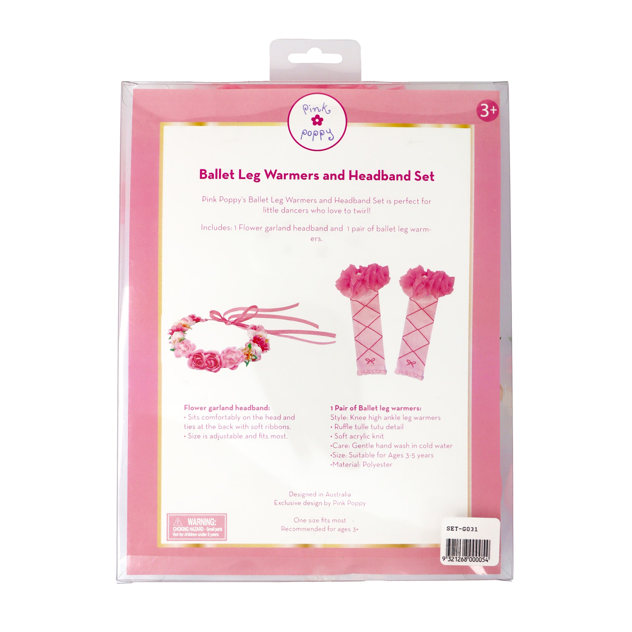 Pink Poppy's Ballet Leg Warmers and Headband Set is perfect for little dancers who love to twirl! The cute flower garland headband sits comfortably on her head, with pretty 3D flowers in shades of pink and white, and ties with a soft ribbon for comfort. The set also comes with ballet leg warmers, made from super-soft knit fabric, complete with ballet ribbon bow graphics and a tulle tutu at the top. Whether she's dancing at home or off to ballet class, this adorable set will make her feel like a real ballerina! A perfect gift for any ballet lover.