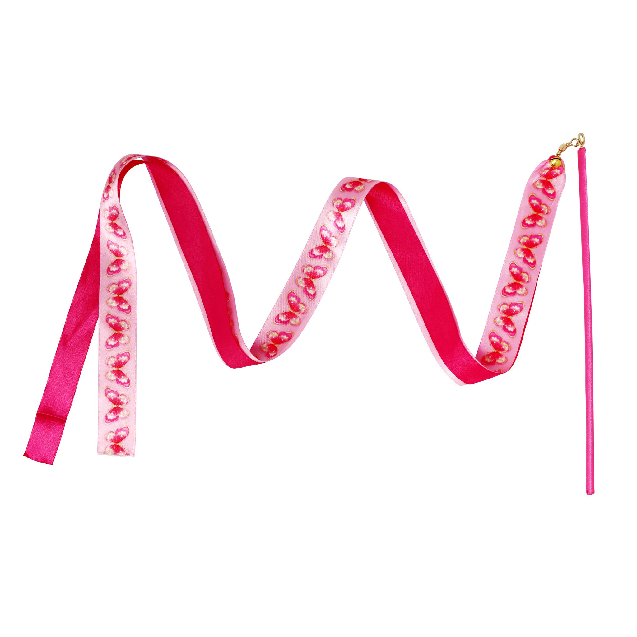 Pink Poppy's Dazzling Butterfly Ribbon Wand is the perfect item to twirl and dance with! It is constructed from a semi-flexible light pink satin-covered handle and contains 2 long satin ribbons. One pink with butterflies printed on, and one hot pink ribbon so you can twirl around you! It features a swivel joint at the head so that the ribbons can twirl effortlessly without getting tangled and a small bell so you can dance in time to the jingle.