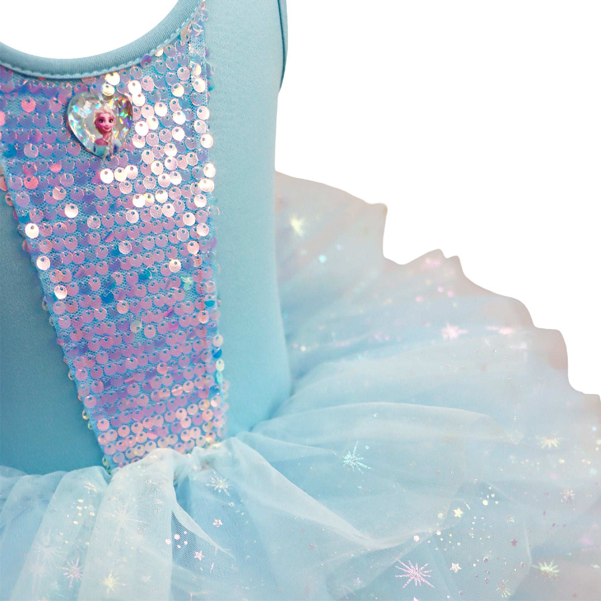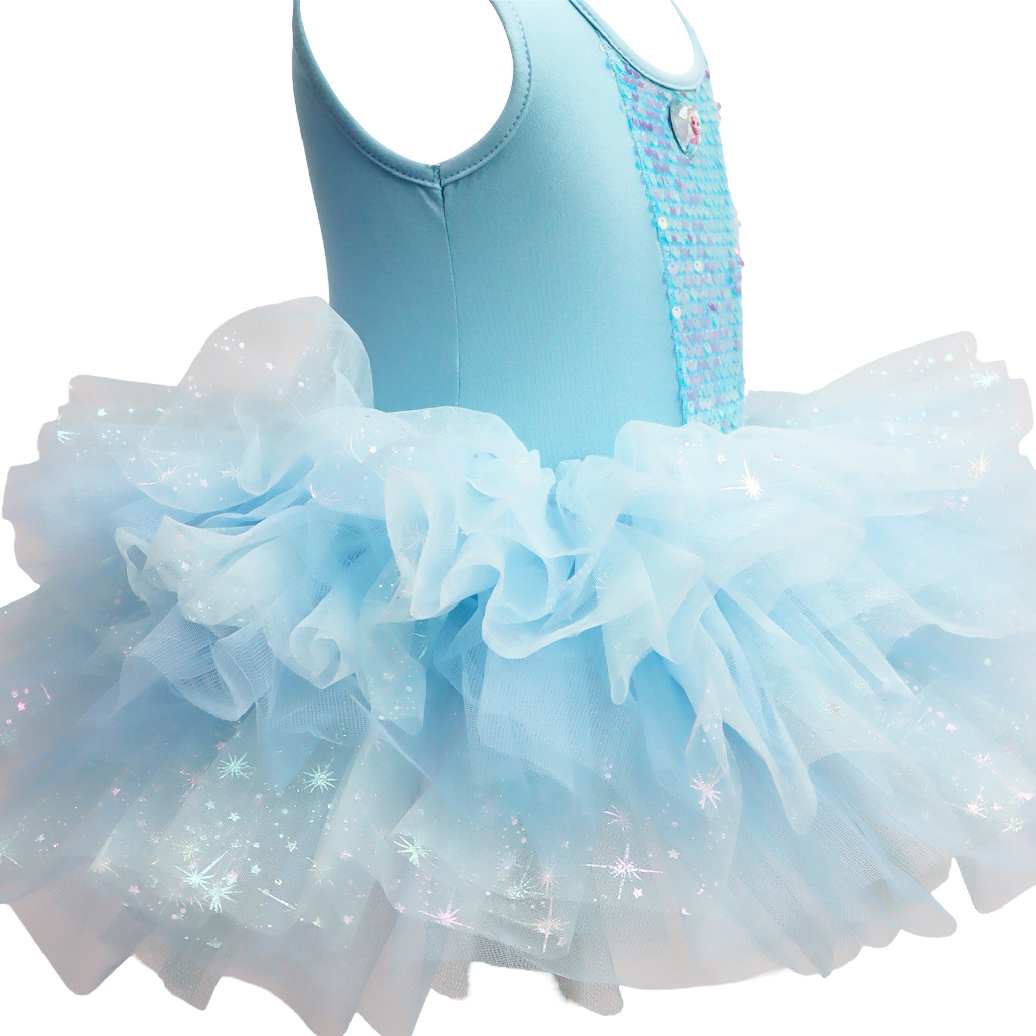 Introducing an Official Disney Frozen Elsa Fashion Tutu designed by Pink Poppy. This tutu, inspired by Elsa, features a stretch jersey bodice, a sequin centre panel, and a printed Elsa gemstone. The tutu skirt, reflecting Elsa's magic, is made of multi layers of gathered tulle with snowflake pattern, integrated leotard pants, elastic waistband. Perfect for dress-up, birthday parties, and special occasions, this enchanting outfit will make every adventure magical!