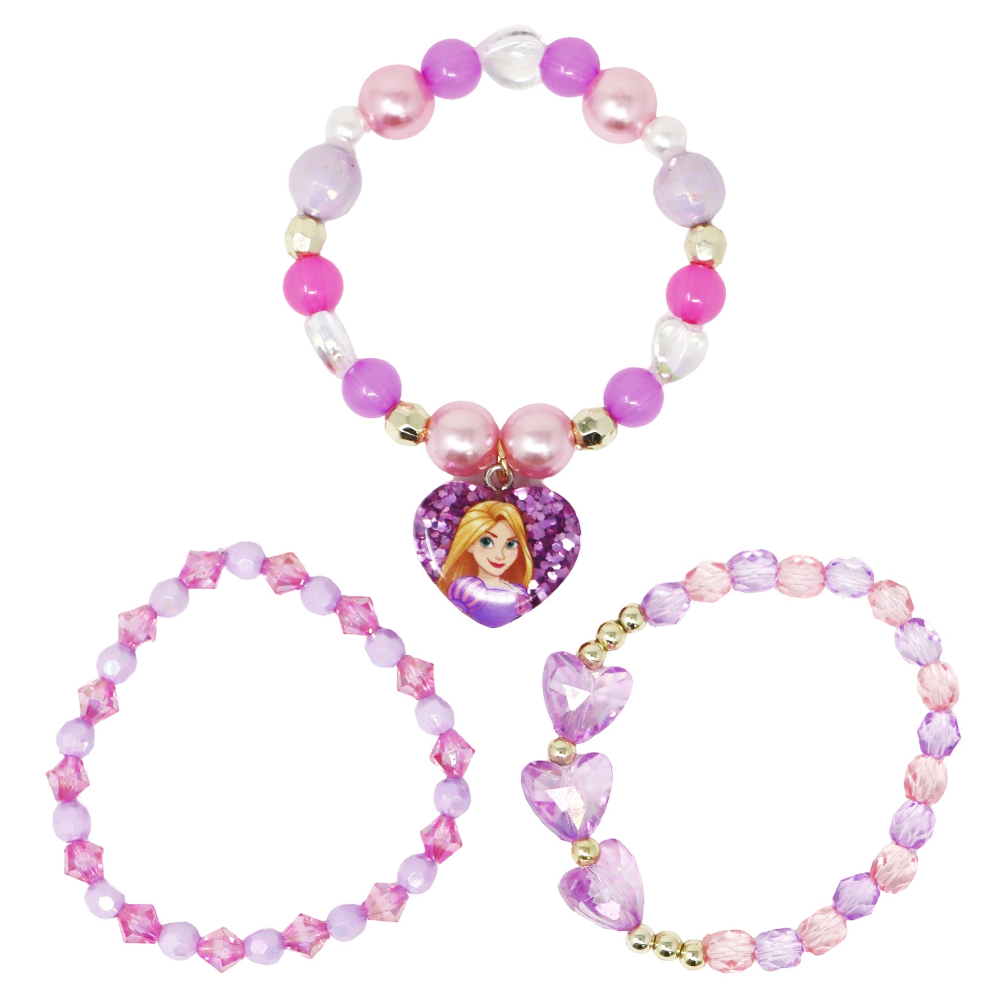 Complete their Rapunzel outfit with this Disney Princess Rapunzel Bracelet Set! It features a heart pendant with Rapunzel printed on a glitter gem. The quality elastic allows for a comfortable stretch fit. This set comes with three gorgeous bracelets that all embody the magic of Rapunzel.