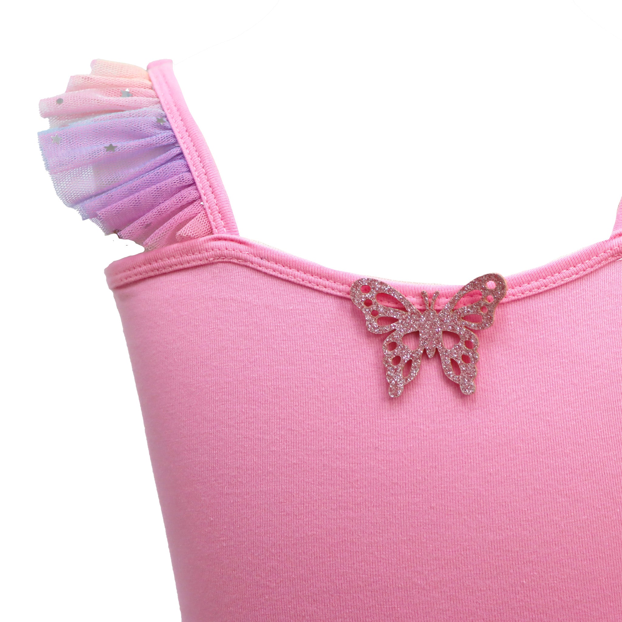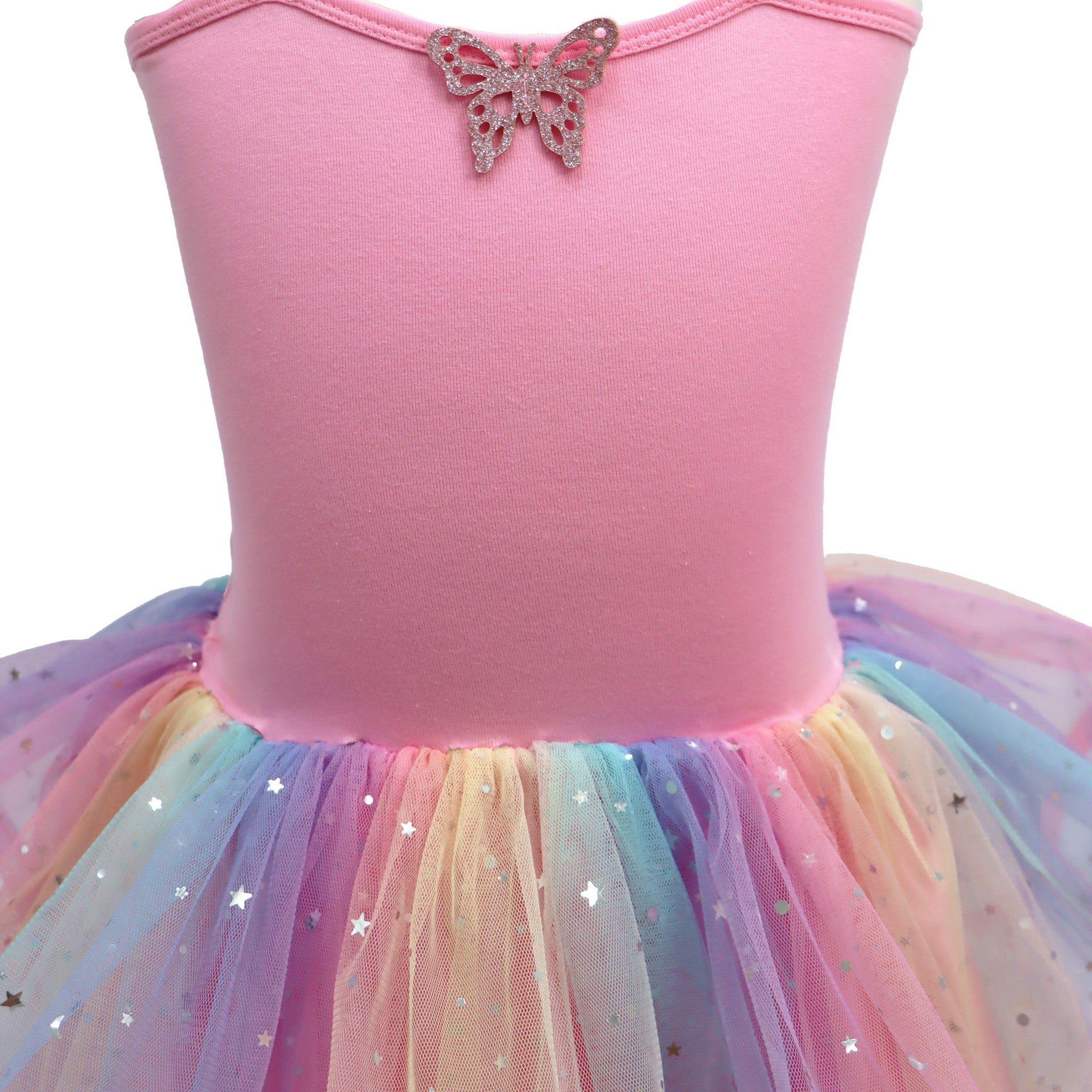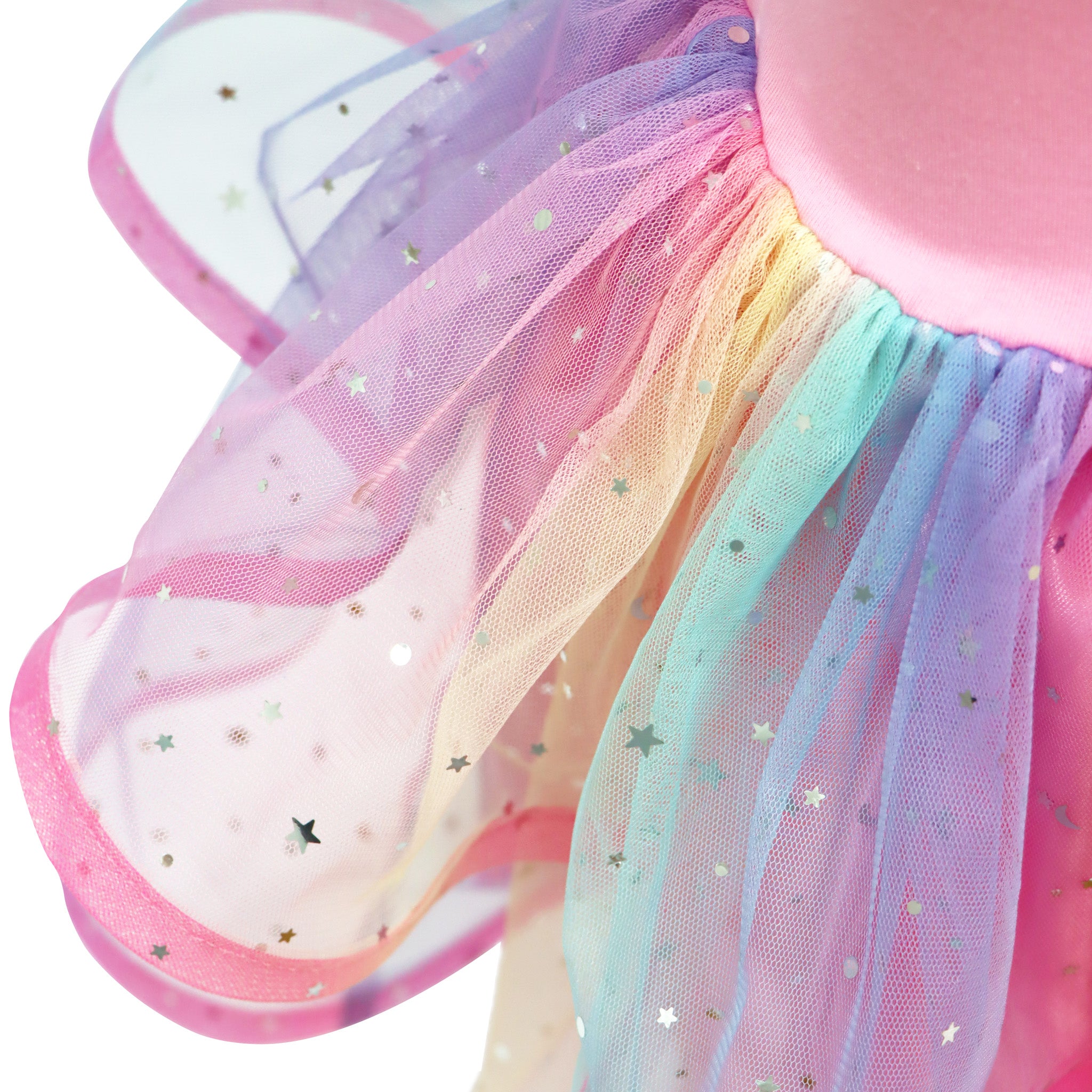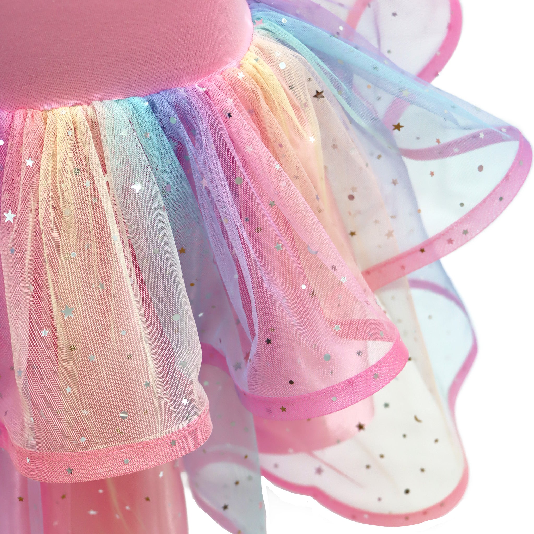 This enchanting dress features a comfortable stretch jersey bodiceadorned with a sparkling glitter butterfly, complemented by a two-layered skirtcrafted from exquisite rainbow tulle. The skirt is embellished with shimmeringsilver stars, moons, and circles that catch the light with every twirl. Beneaththe tulle, a soft lining ensures comfort and adds a luxurious feel, making itthe perfect choice for dress-up play and special events.