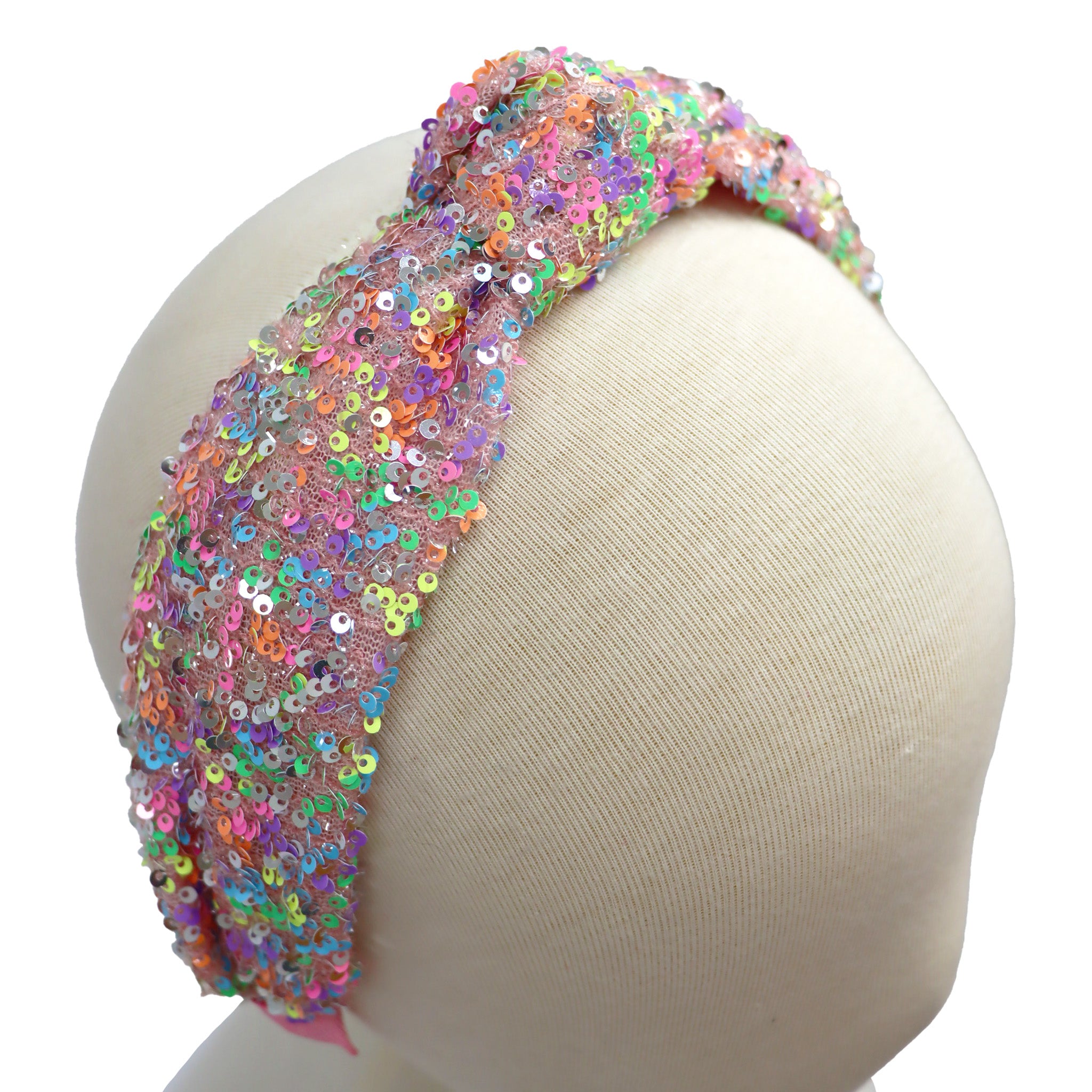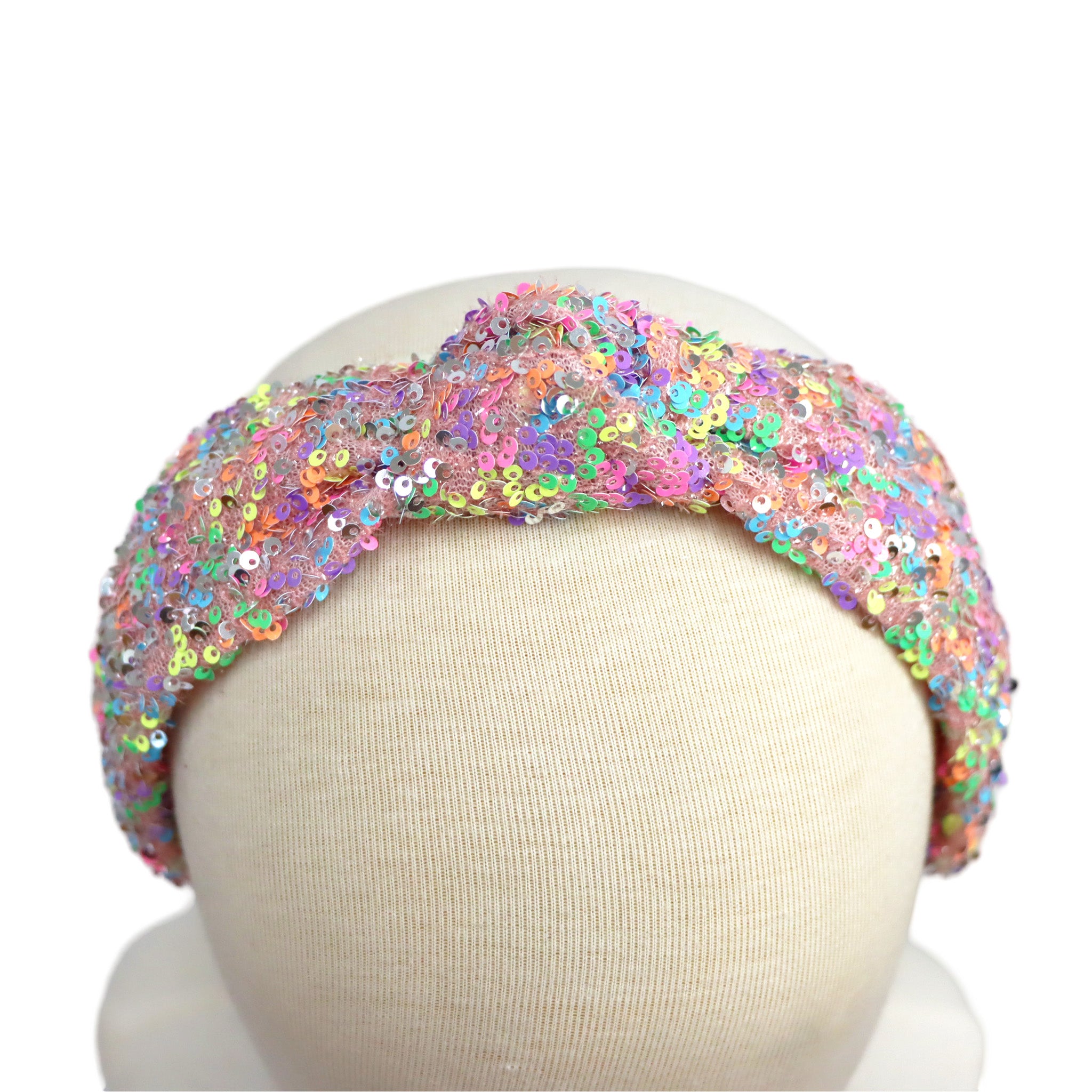 Introducing Pink Poppy’s Dreamland Sequin Headband. This stunning headband features a pink satin base adorned with a dazzling rainbow sequin fabric and a chic knot design. Elevate your style with this glamorous accessory and let your look sparkle with every turn.