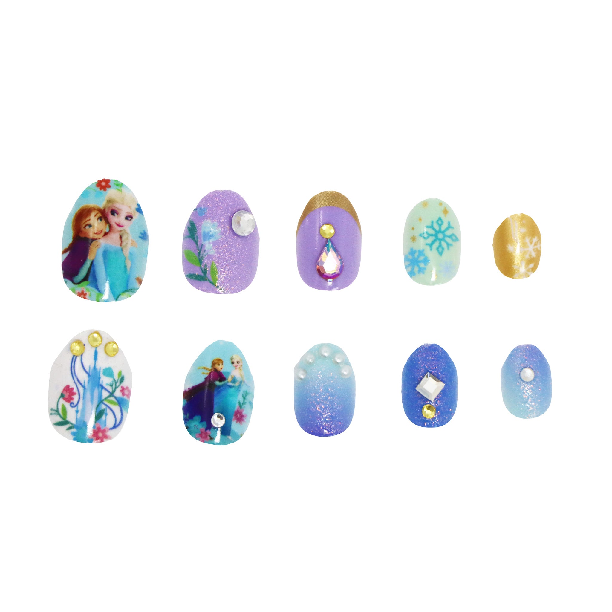 These pre-gluedpress-on nails provide an easy, mess-free application – just peel, press, and shine with no drying time required! Each set of 10 nails is adorned with enchantingFrozen prints and 3D embellishments that add a shimmering Frozen-inspired charmto every fingertip.