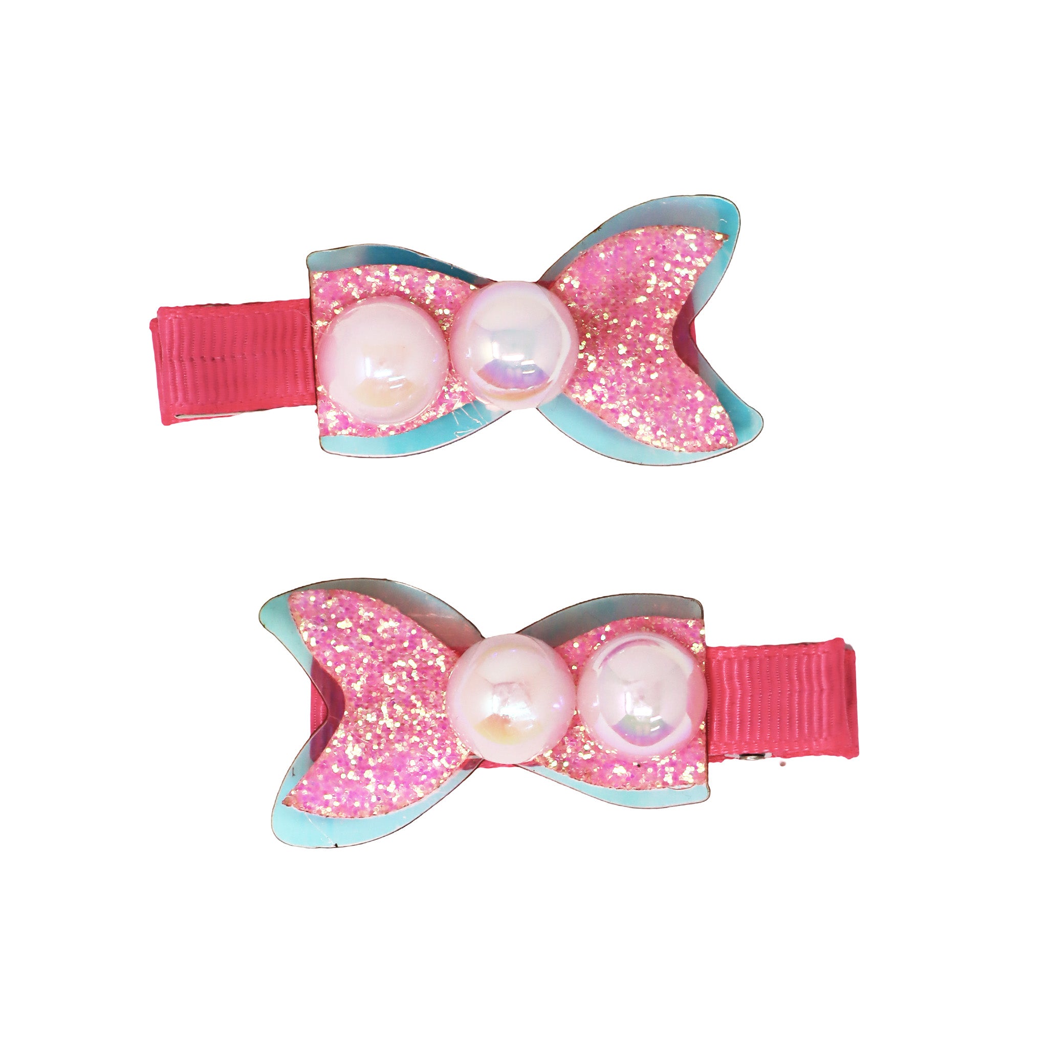 This adorable set includes two alligator hair clips, each wrapped in soft pink ribbon to ensure a gentle, snag-free fit that’s perfect for fine or top hair. Featuring an elegant glittering mermaid tail design with iridescent jelly finishes and two pearlescent bead details on each clip, these hair clips shimmer beautifully and add instant personality to everyday outfits, party looks and dress-ups.