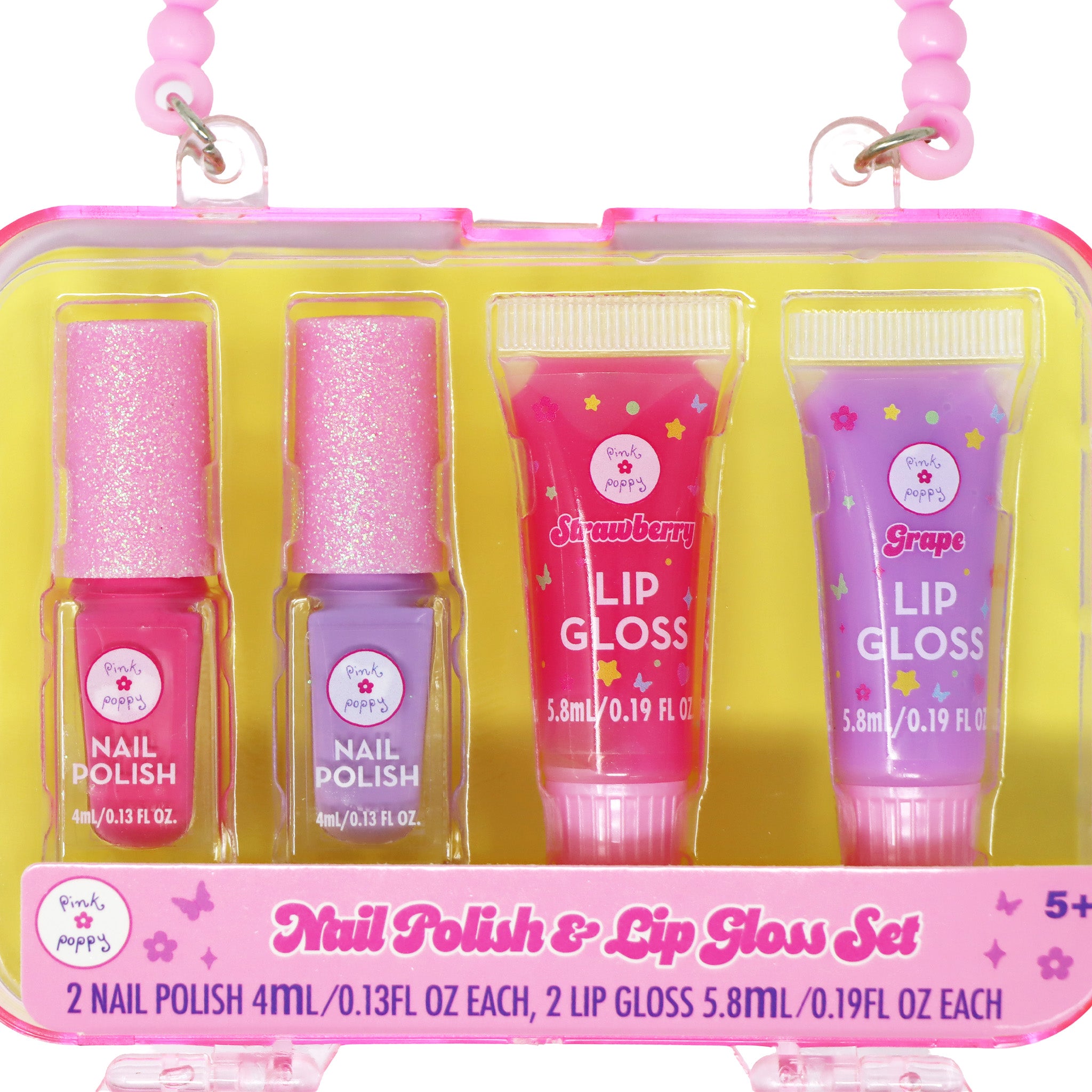 Inside, this fun and practical kids makeup set includes two water-based kids nail polishes and two scented fruity-flavoured lip glosses, all specially formulated to be safe, gentle, and mess-free.