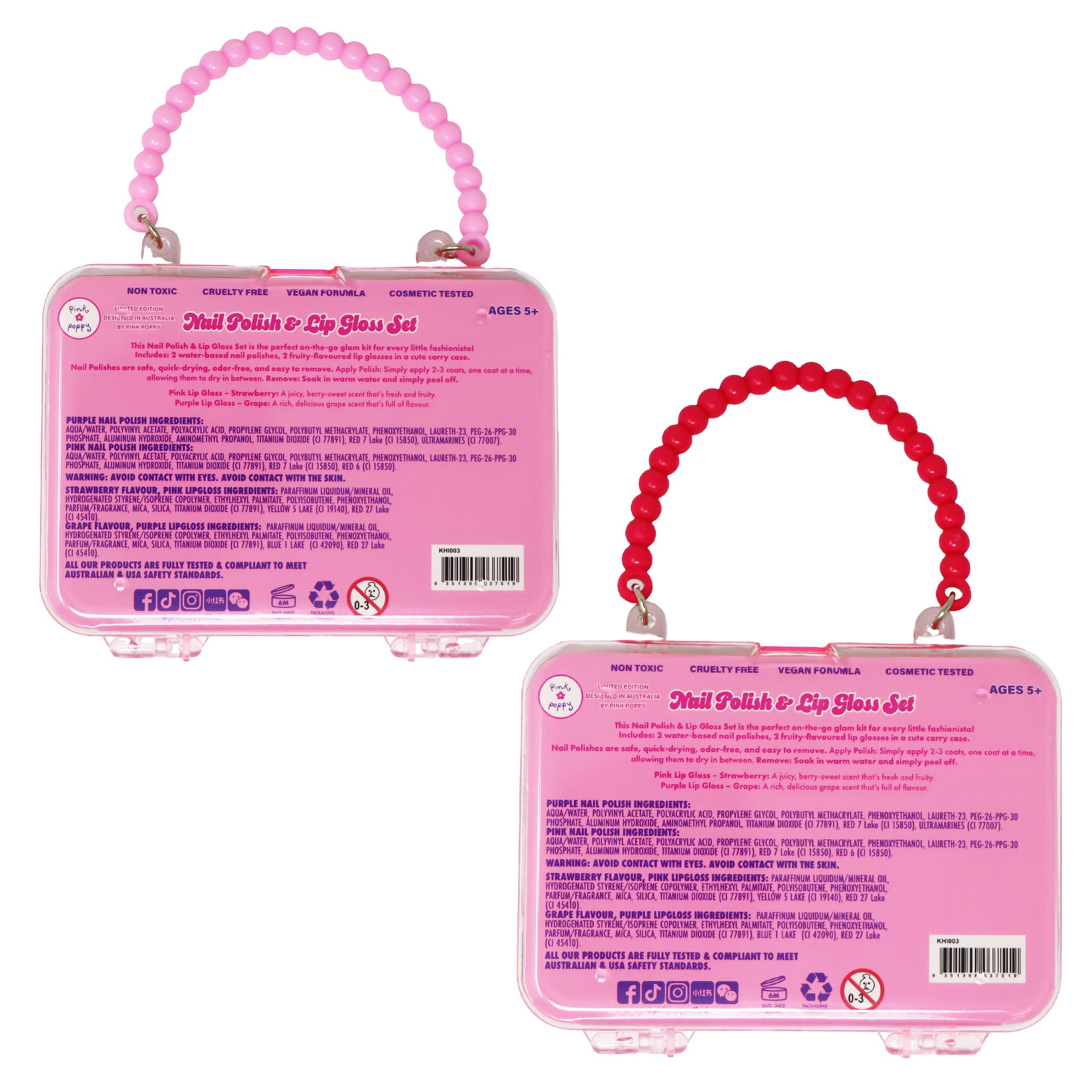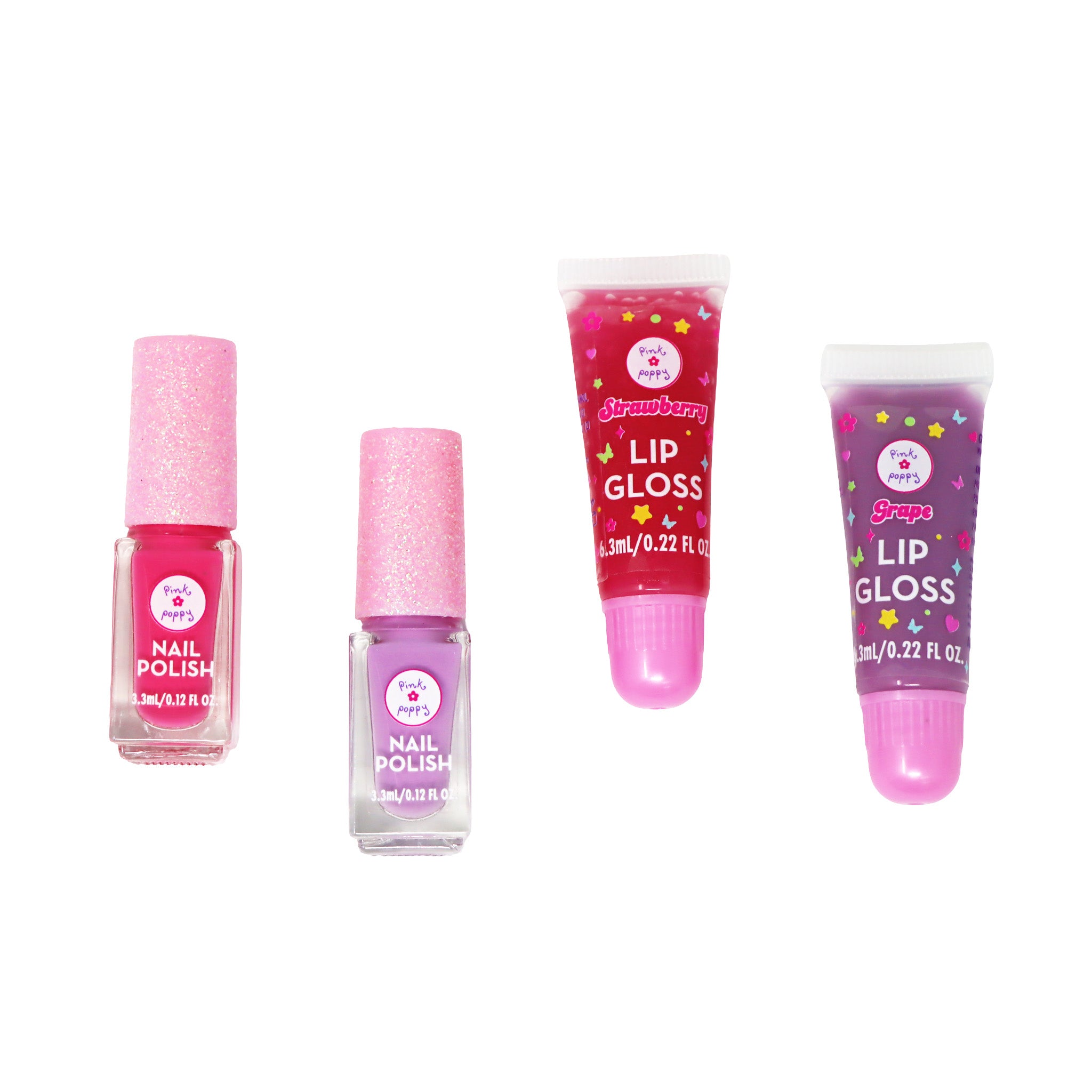 The shimmer Strawberry Lip Gloss has a fresh, juicy berry scent, while the shimmer Purple Grape Lip Gloss offers a rich, delicious grape fragrance — perfect for dress-ups, playdates, and on-the-go glam fun.