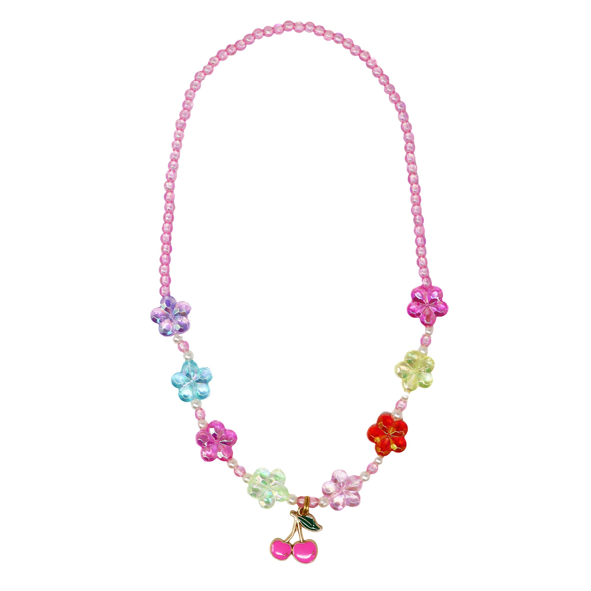 Featuring a gold metal enamel cherry charm paired with iridescent faceted daisy beads on a pretty pink stretch necklace. It's the perfect gift for best friends, siblings, Friendship Day, or anyone who loves to share.