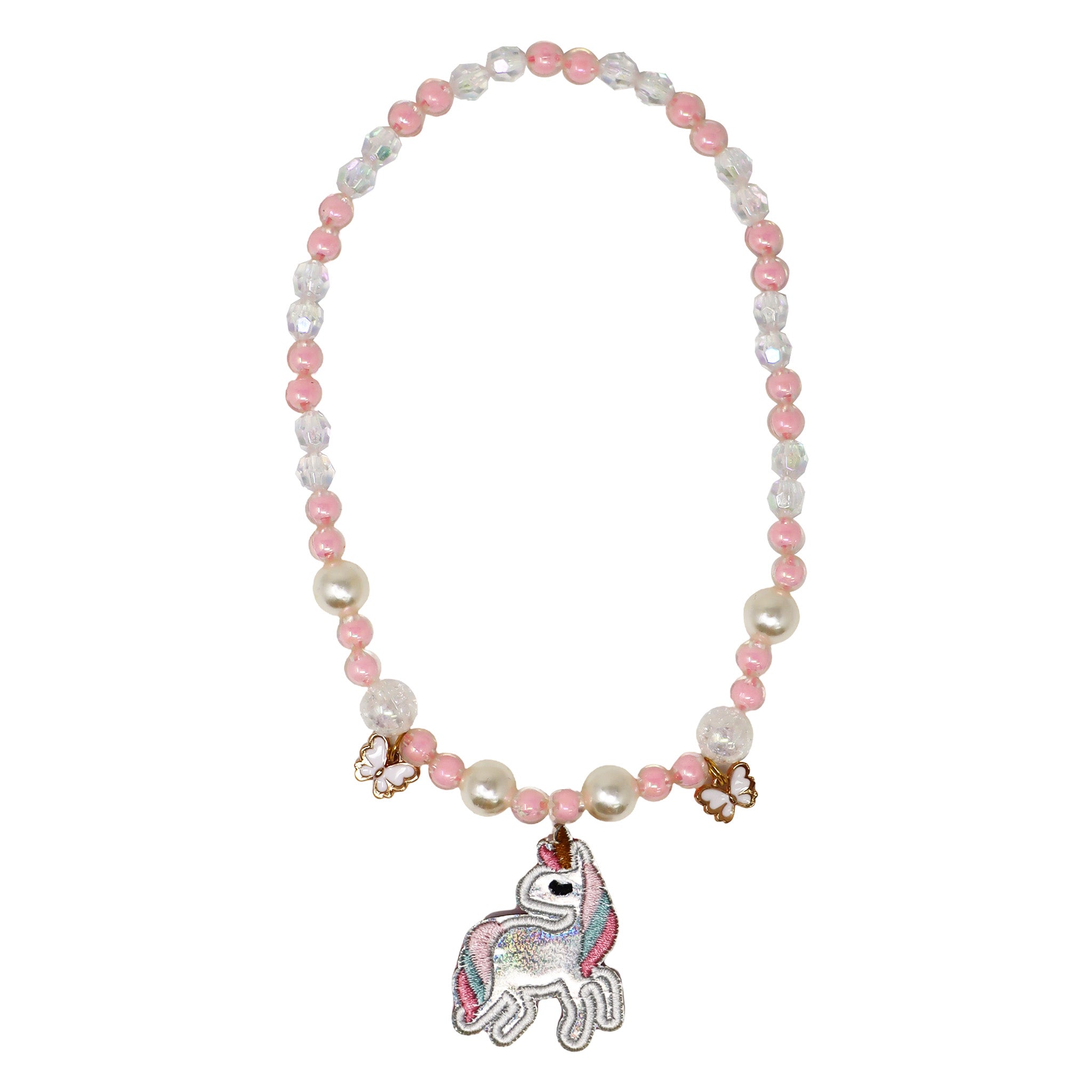 Featuring iridescent pink beads and classic pearl accents, both the necklace and bracelet shimmer beautifully. The hero piece is a sparkly embroidered fabric unicorn pendant, finished with gold-tone enamel butterfly charms for an extra touch of whimsy. It’s sweet, stylish and designed to make every day feel magical.