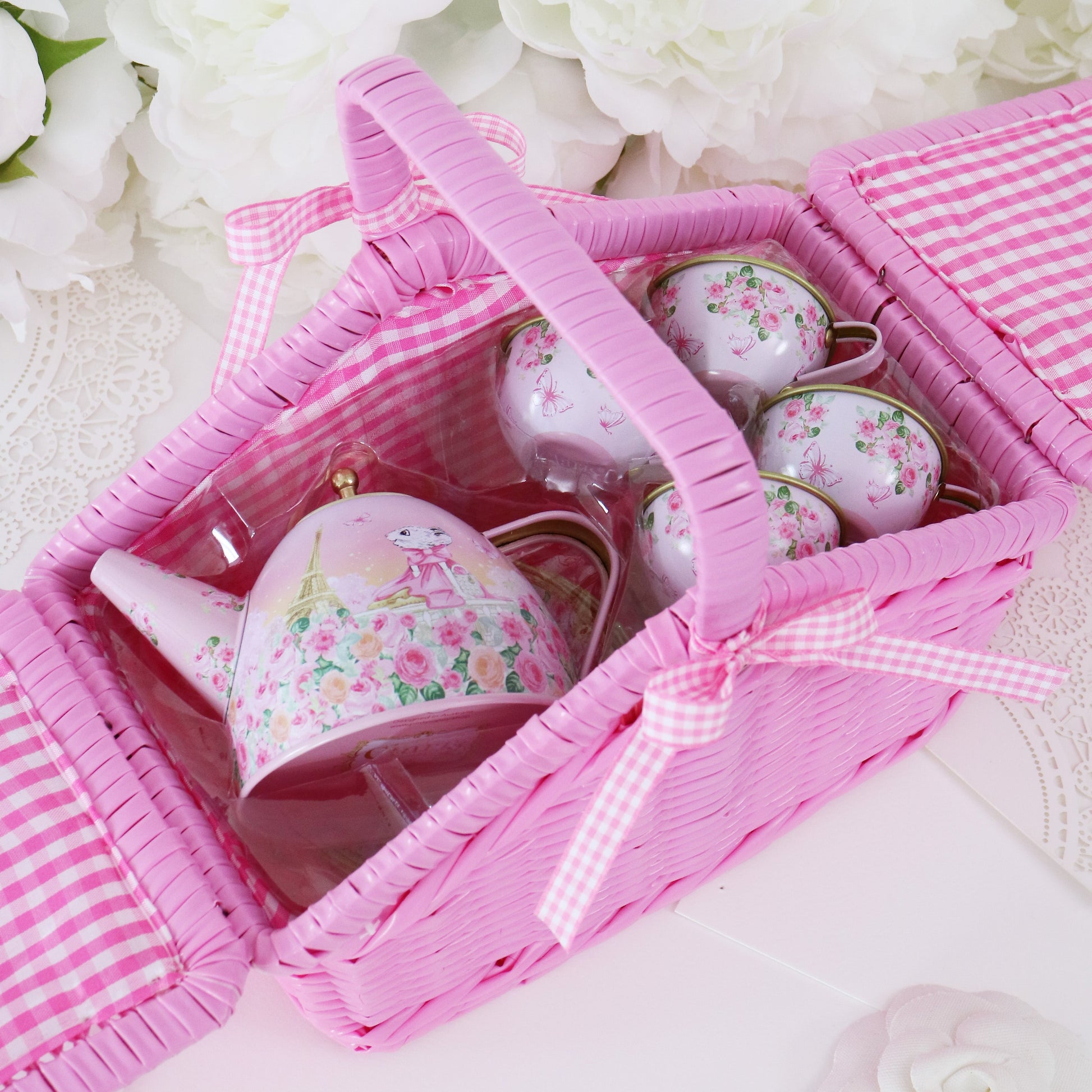 Complete with teapot, cups, saucers, and plates in a beautiful, chic pink picnic basket for easy storage & transportation for all the fun Claris picnics