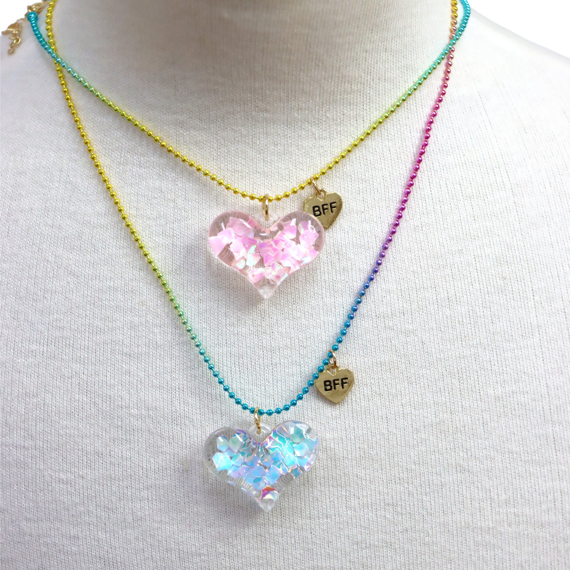 Introducing Pink Poppy's BFF Confetti Heart Necklace Set, the perfect way to celebrate your friendship! This set of two necklaces, one in pink and one in purple, is designed for you and your bestie. Each necklace features a heart-shaped shaker charm filled with fun confetti, and "BFF" written across the top. Whether you're wearing the pink or purple, these playful and vibrant necklaces are a fun way to show off your special bond!