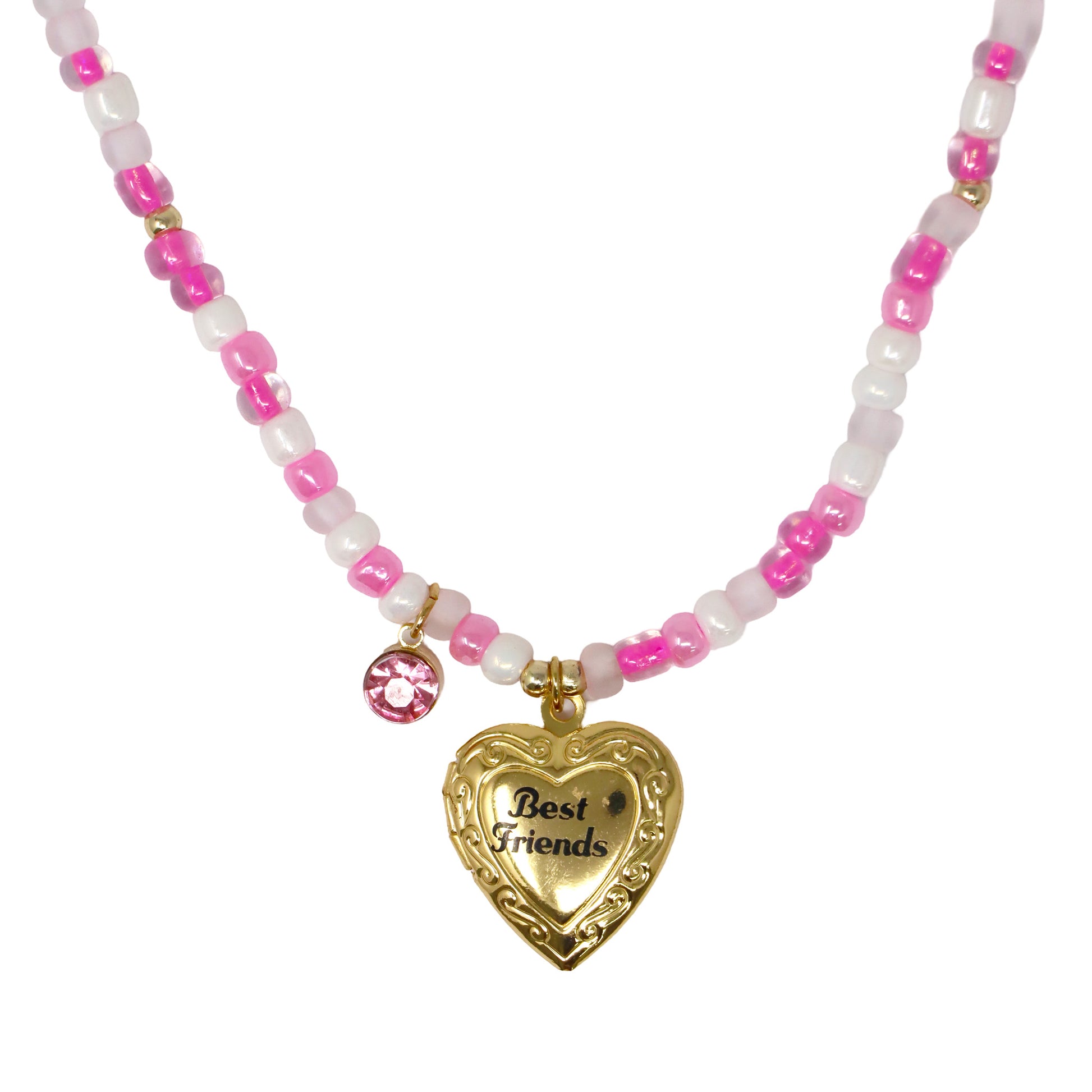 Introducing Pink Poppy's BFF Locket Necklace Set, a stylish way to celebrate your friendship! This set features two gold chain lockets, each with a beautifully designed gold heart at the bottom. Engraved with "BFF" and accented by a sparkling gem—one in light pink and the other in hot pink—these necklaces are perfect for you and your bestie to wear as a symbol of your unbreakable bond!