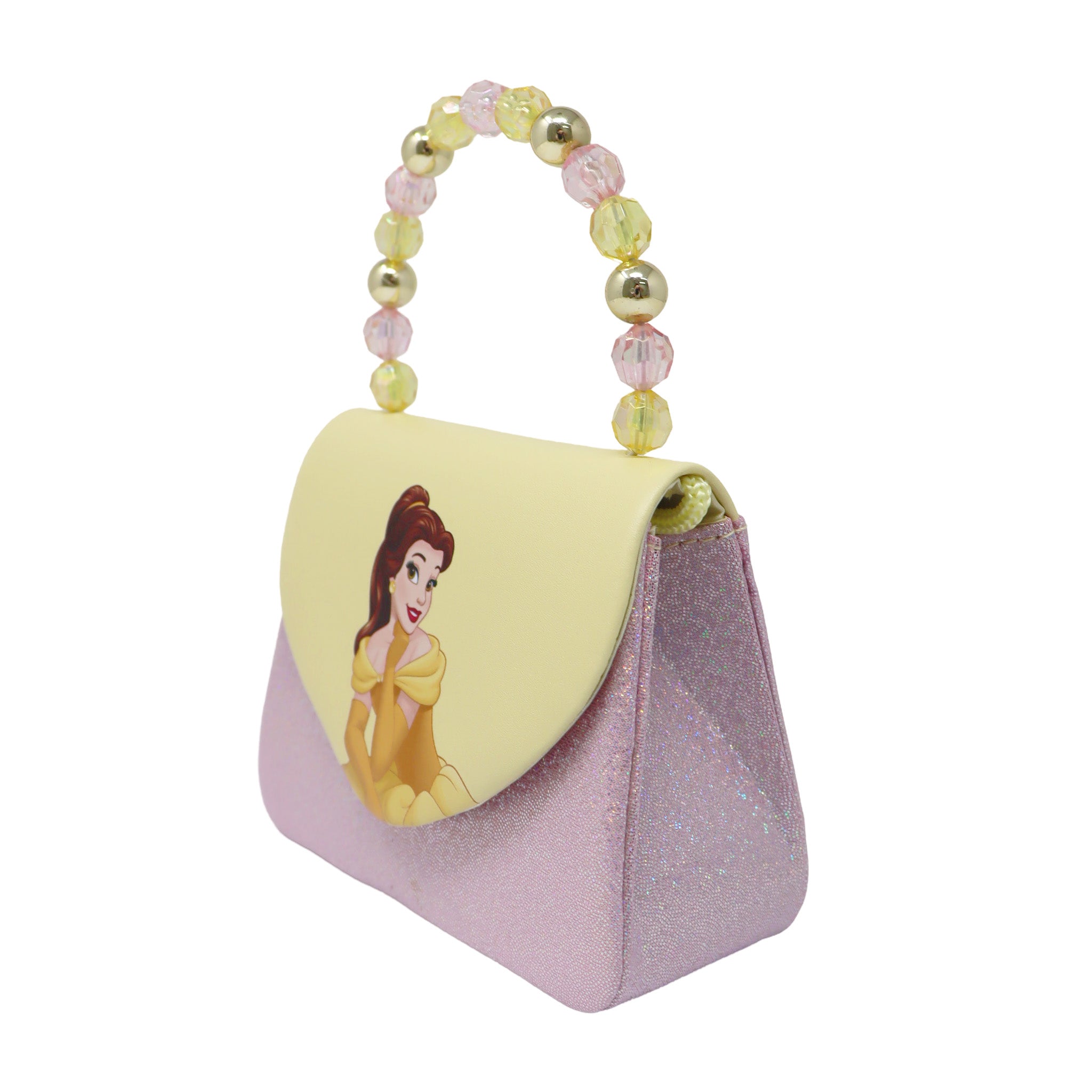 Disney Princess Belle Print Handbag is fabricated in the sparkling fabric of Belle's signature colour and features a Belle print on the envelope top flap. It features a fun beaded handle and an additional shoulder strap for keeping hands free for play.