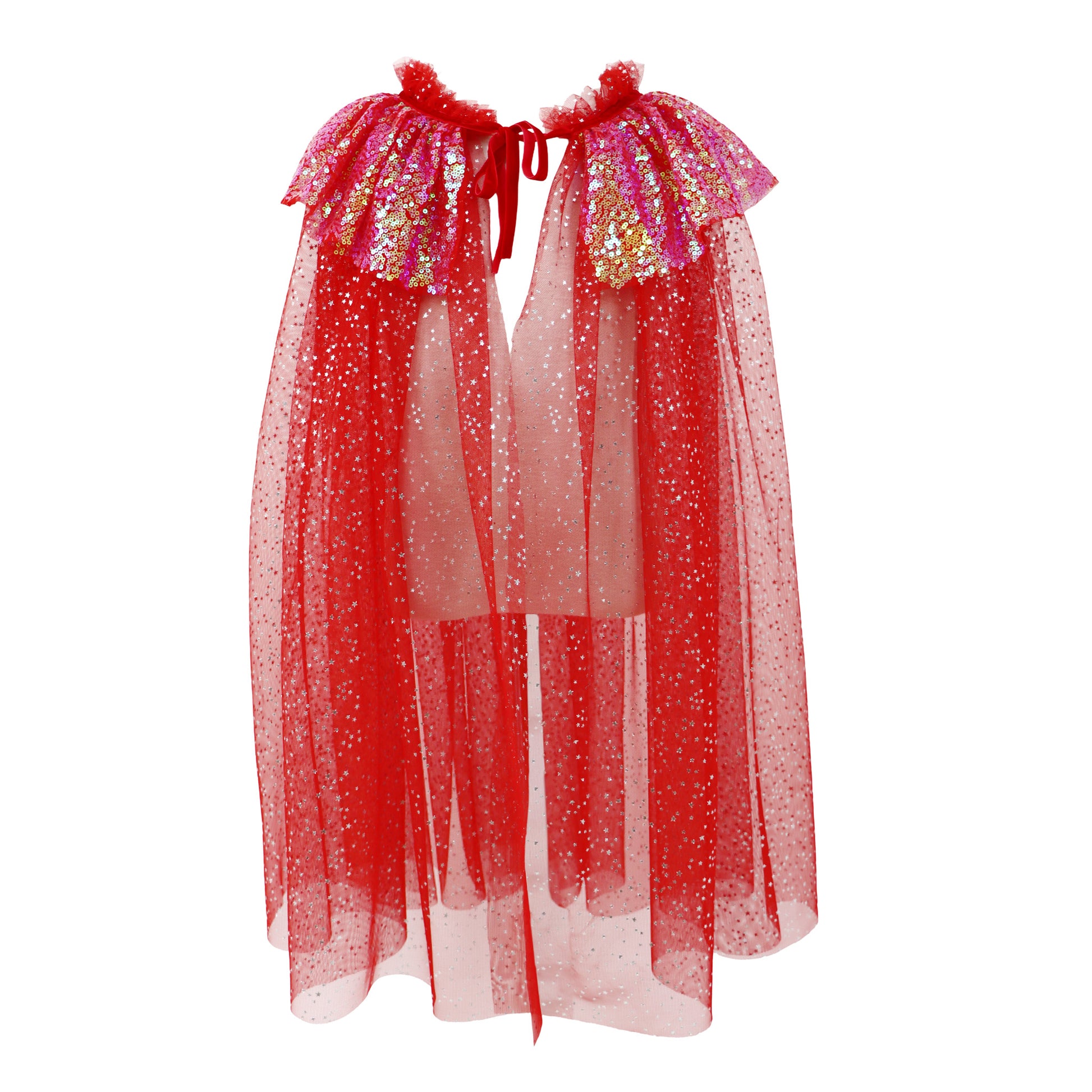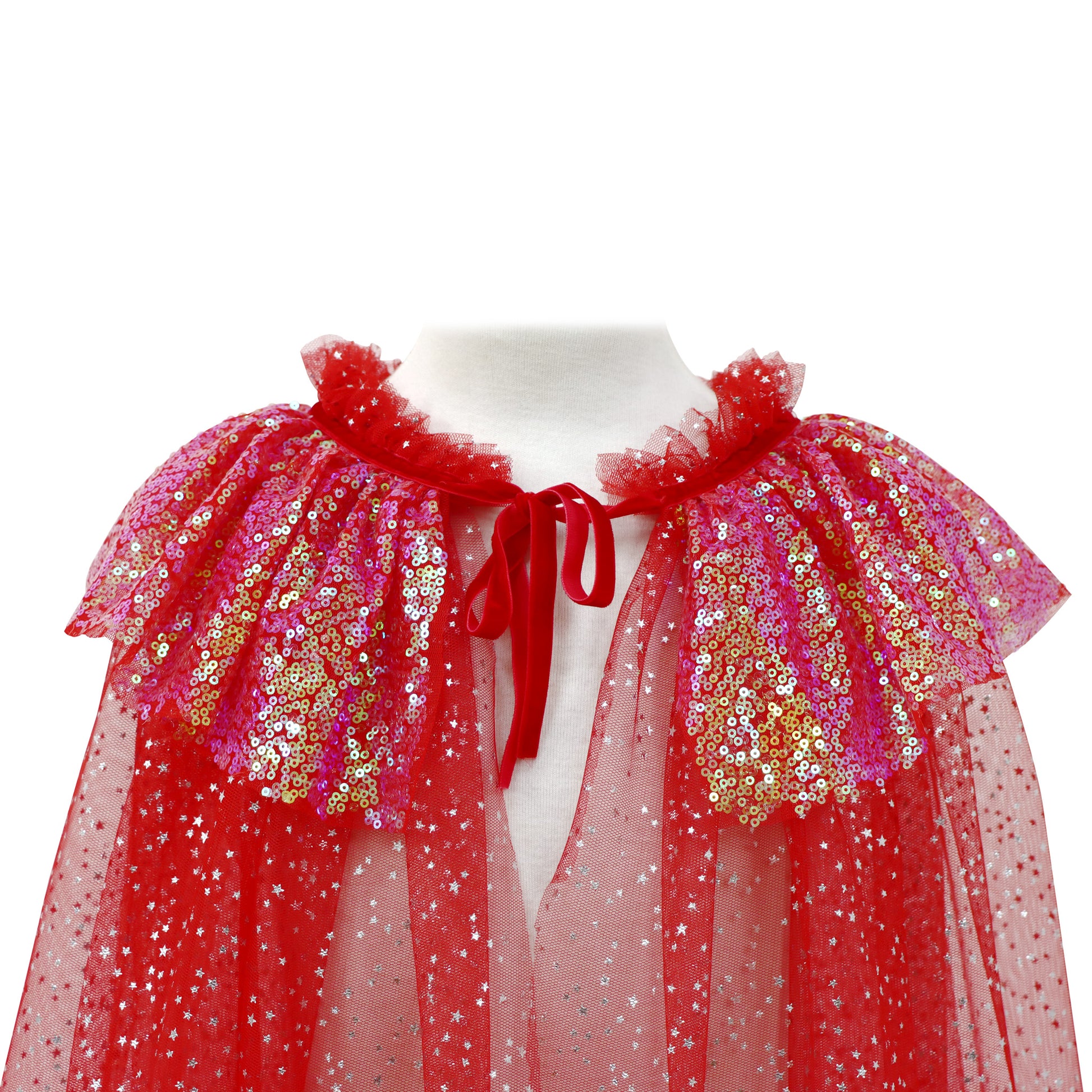 Pink Poppy's Twinkling Christmas Sequin Cape is the perfect accompaniment to a party dress and an essential dress-up accessory to add to their wardrobe. A soft red tulle cape is generously gathered and adorned with a sparkly silver star pattern. The iridescent sequined neckline shimmers and shakes with dance and movement. This cape is quick and easy to tie on with a glittery pink necktie.